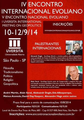 Articles Alain Soral en conférence au Brésil avec Alexandre Douguine 25 août 2014 Rencontre internationale Evolienne : http://encontronacionalevoliano.com.br/ Navigation de l’article Tradition catholique, remède au nouvel ordre mondial – colloque 20 septembreConférence de Laurent Guyénot à Strasbourg