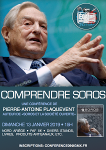 E&R Ariège recevra Pierre-Antoine Plaquevent, fondateur et rédacteur en chef du site Les Non-alignés, le dimanche 13 janvier 2019 à 15h au nord de l’Ariège pour une conférence de présentation de son ouvrage Soros et la société ouverte : métapolitique du globalisme.