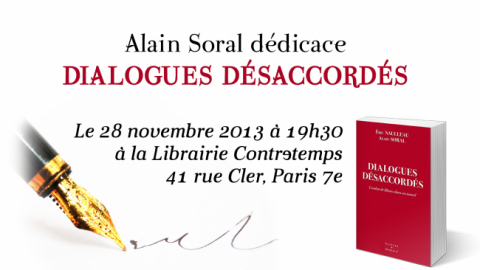 Alain Soral signera son nouveau livre, Dialogues désaccordés , coécrit avec Éric Naulleau, le jeudi 28 novembre à partir de 19h30 à la librairie Contretemps, 41 rue Cler, Paris 7e.