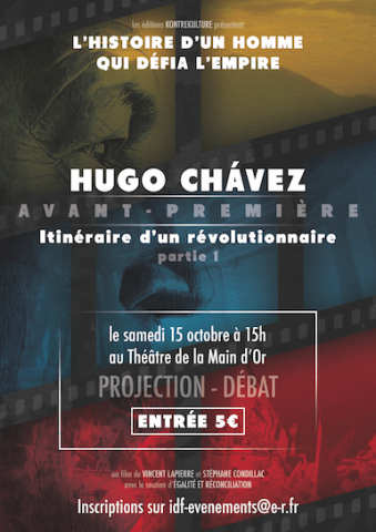 L’équipe d’E&R Île-de-France accueillera Vincent Lapierre le samedi 15 octobre 2016 à 15h au Théâtre de la Main d’Or à Paris pour la projection en avant-première du film Hugo Chávez – Itinéraire d’un révolutionnaire.