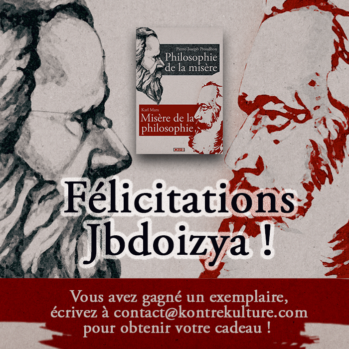 Mise à jour du 6 février 2020 : Félicitations de la part de l'équipe Kontre Kulture à jbdoizya, qui a été le premier à deviner la prochaine sortie : Philosophie de la misère de Pierre-Joseph Proudhon et Misère de la philosophie de Karl Marx ! Il remporte donc un exemplaire gratuit.