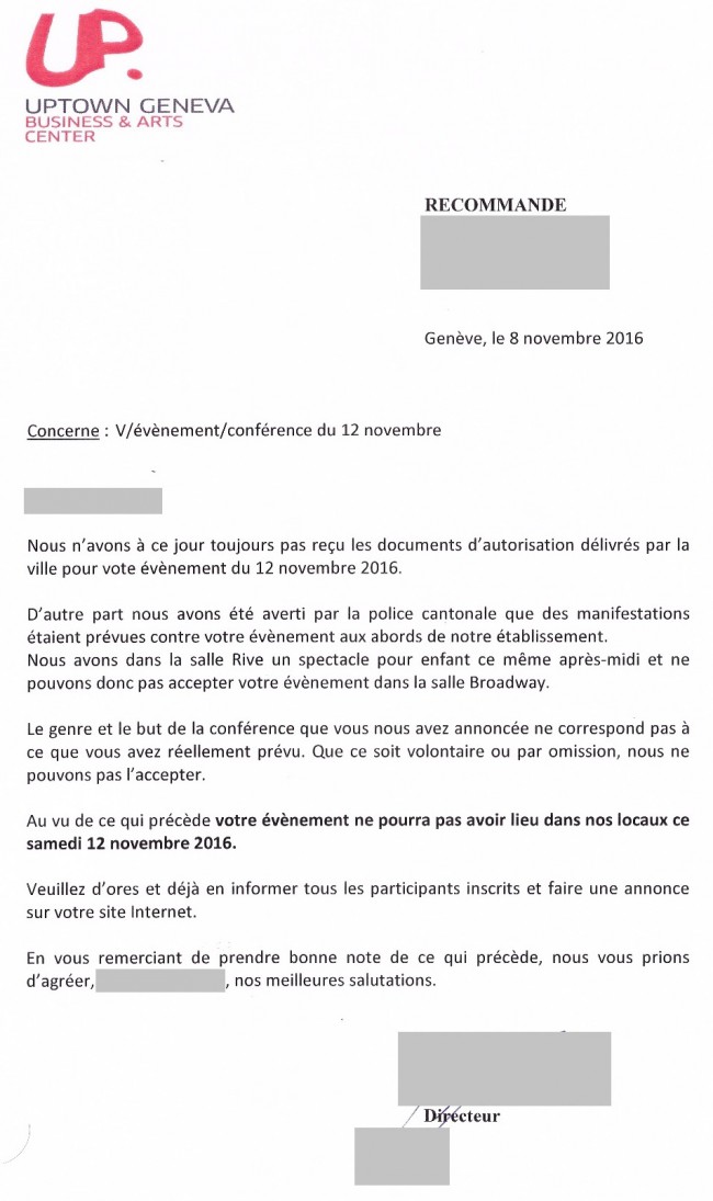 Le courrier recommandé envoyé à E&R par le responsable de la salle menacé :