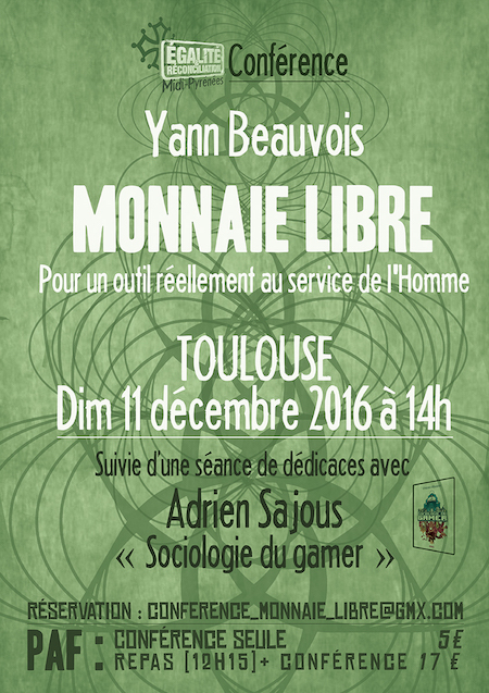 L’équipe d’E&R Midi-Pyrénées accueillera Yann Beauvois le dimanche 11 décembre 2016 à 14h à Toulouse pour une conférence intitulée « Monnaie libre, pour un outil réellement au service de l’homme ».