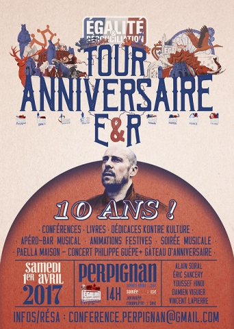 Pour fêter les 10 ans d’Égalité & Réconciliation, la section perpignanaise vous propose un ensemble de conférences et de séances de dédicaces, auxquelles viendront s’ajouter un apéro-bar musical, des animations festives et un concert de Philippe Guêpe (artiste Kontre Kulture Musique).
